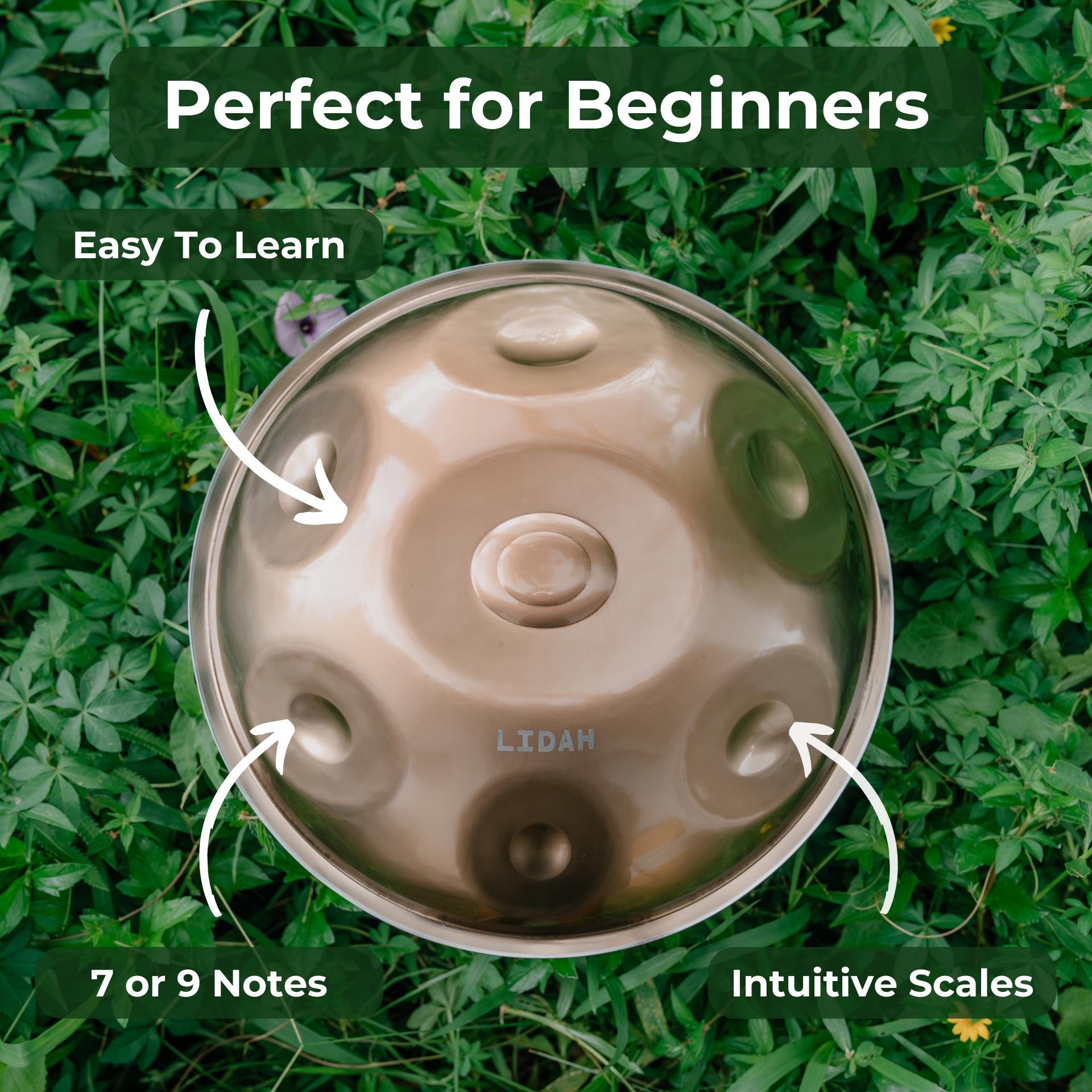 Most beginners can play simple rhythms within days. With practice, you’ll quickly discover more patterns and techniques. To support your journey, every handpan includes free lifetime access to the Master the Handpan course: over 70 step-by-step video lessons. This makes learning fun and accessible at your own pace.