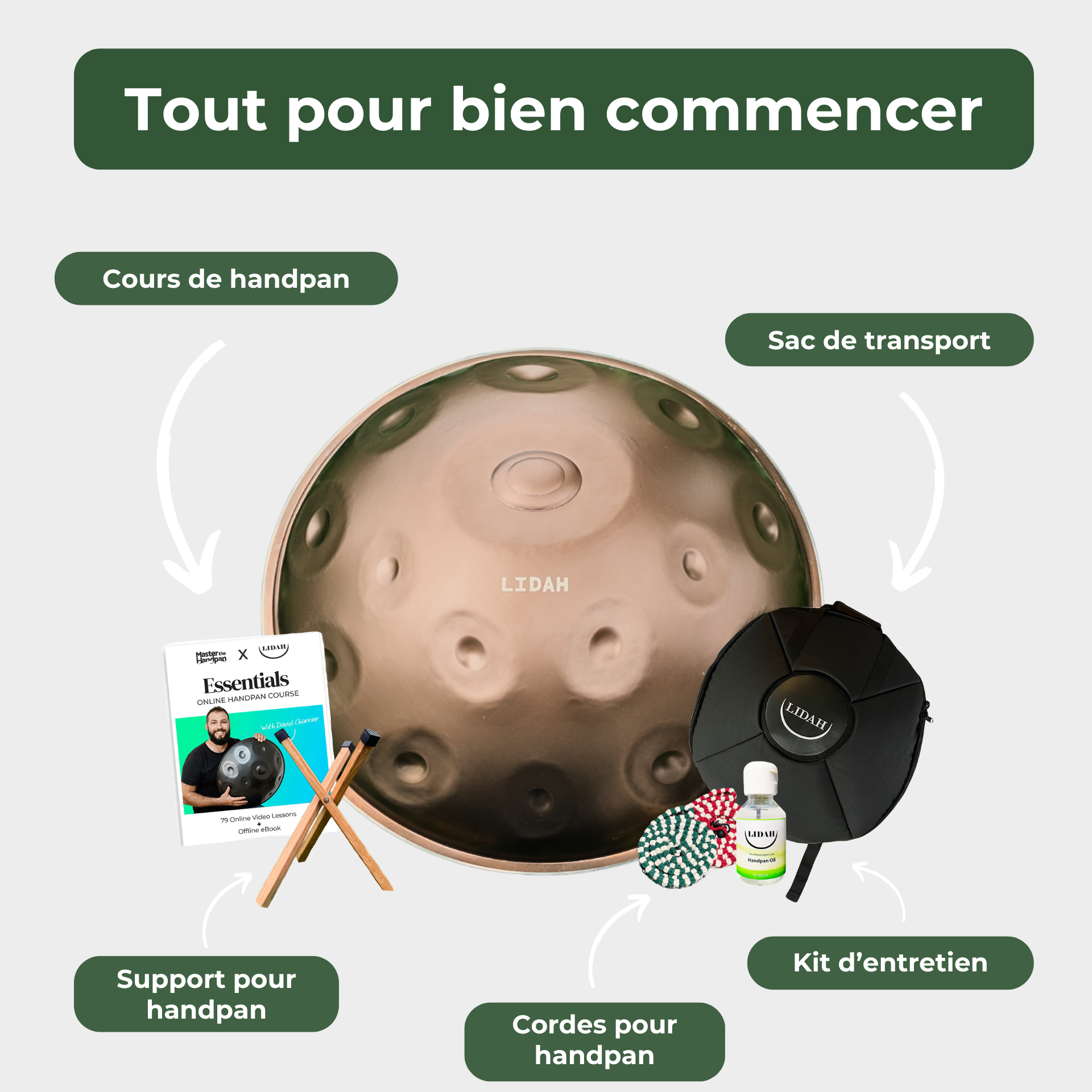 Lorsque vous commandez un handpan LIDAH, vous ne recevez pas seulement un instrument, vous recevez un package complet pour commencer votre voyage immédiatement :